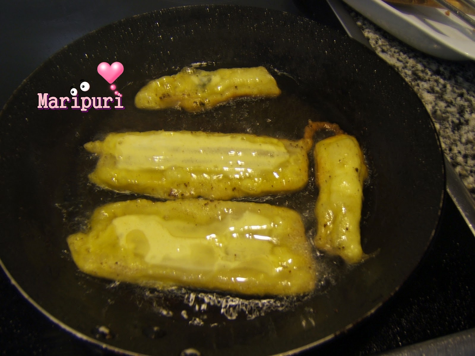 En una sartén con aceite confitamos el pimiento verde cortado en cuartos, es decir lo freímos a baja temperatura hasta que esté hecho.